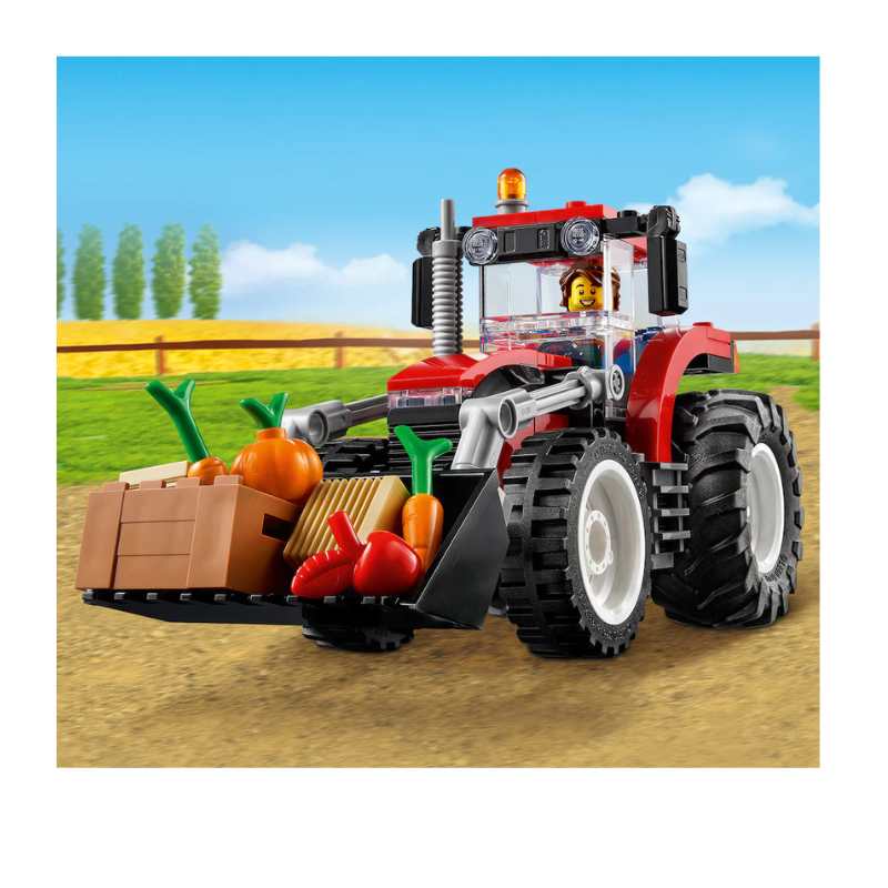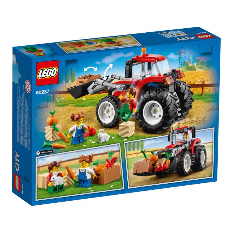 Uputi se na selo u prepoznatljivom traktoru iz serije LEGO® City. Traktor ima velike stražnje gume, pa vožnja po otpornom terenu nije nikakav problem. Utovari bale sijena i sanduk s bundevom, jabukom i mrkvama u žlicu traktora. Zatim ih podigni u zrak i odvezi do poljoprivrednika i njegove kćeri koji trebaju nahraniti gladnog zeca!